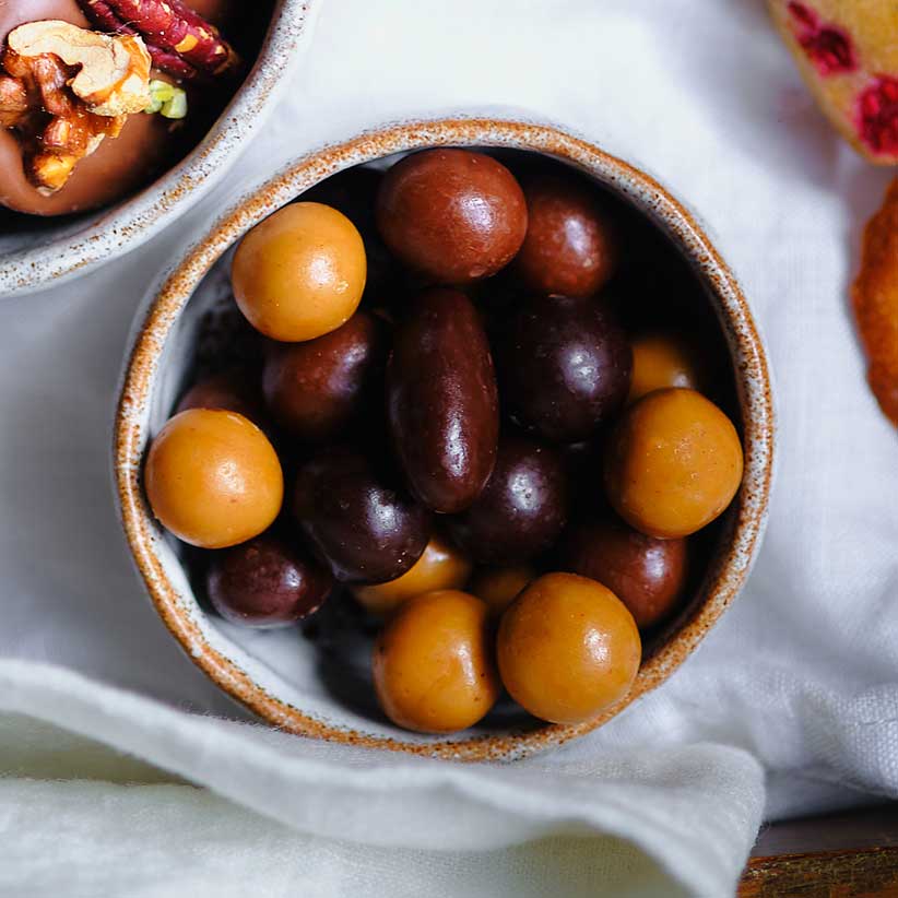 Assortiment chocolaté très gourmand à croquer sans modération entre noisettes et amandes enrobées de chocolat végétal aux saveurs intense, lactée ou caramel selon les bonbons.