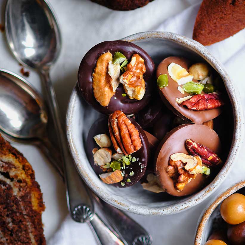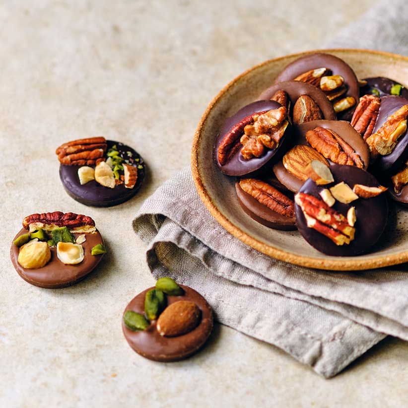 Plaisir et pure gourmandise avec cet assortiment de palets au chocolat noir et au chocolat au lait surmontés, selon les mendiants, d’une association de différents fruits secs à coques.